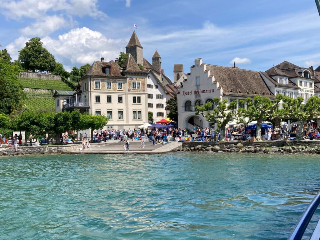 Arsitek atap rumah-rumah bundar. Dominan jendela kaca dan kayu. Ini jarak dermaga paling jauh, maka sekarang saatnya kapal kembali ke Zürich lagi. Rüschlikon, dermaga berikutnya. Disambut bendera tiga warna; biru, merah dan putih. Sebuah patung perempuan gemuk telanjang terbuat dari metal.