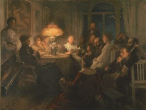 Lukisan “Vänner” digarapnya selama beberapa tahun, dengan terlebih dulu lewat serangkaian sketsa awal. Di dalam lukisan tersebut, ia menggambarkan kawan-kawannya yang sering berkumpul bersama di rumahnya berdiskusi berbagai hal, dari soal budaya hingga soal politik. Di pusat lukisan tersebut, dalam terang lampu meja, duduk Ellen Key, seorang intelektual feminis-sosialis yang ide-idenya akan pendidikan bebas bagi anak-anak dan kesetaraan perempuan punya pengaruh besar di kalangan kaum terdidik elite Swedia (dan Eropa umumnya) pada masa itu. Contohnya, perempuan bisa punya anak tanpa harus menikah resmi – tergolong ide radikal saat itu.