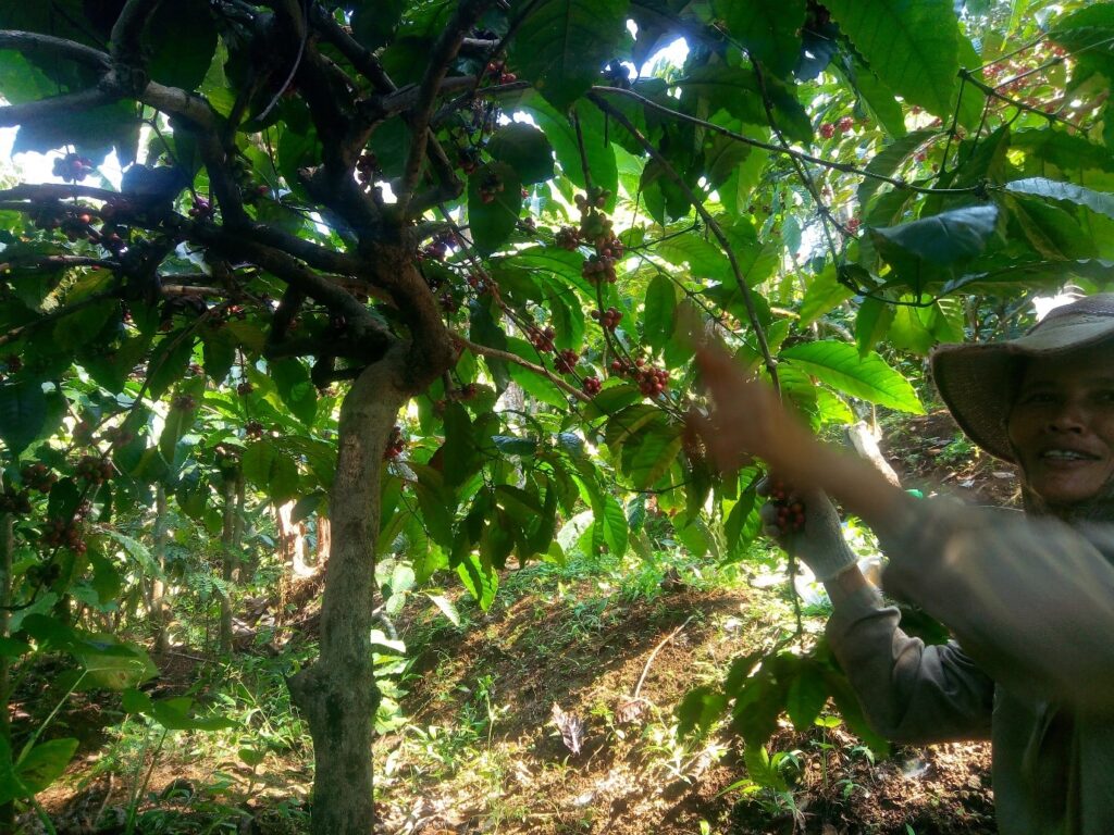 Jaraknya tak begitu jauh. Dengan motor, sekitar lima menit. Sedangkan di alas, Pak Hajir bersama mantu dan cucunya sudah giat memetik buah kopi. Kata Bu Mugiyem, kebun yang saya datangi termasuk kebun yang dibeli dari besannya—bapak dari mantunya. Waktu itu harganya sekitar 3 juta—saya tidak menanyakan kapan tahunnya dan berapa luasnya, tapi menurut Bu Mugiyem, untuk sekarang ini kebun tersebut tidak bisa didapat dengan harga 50 juta.