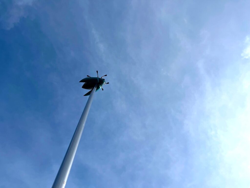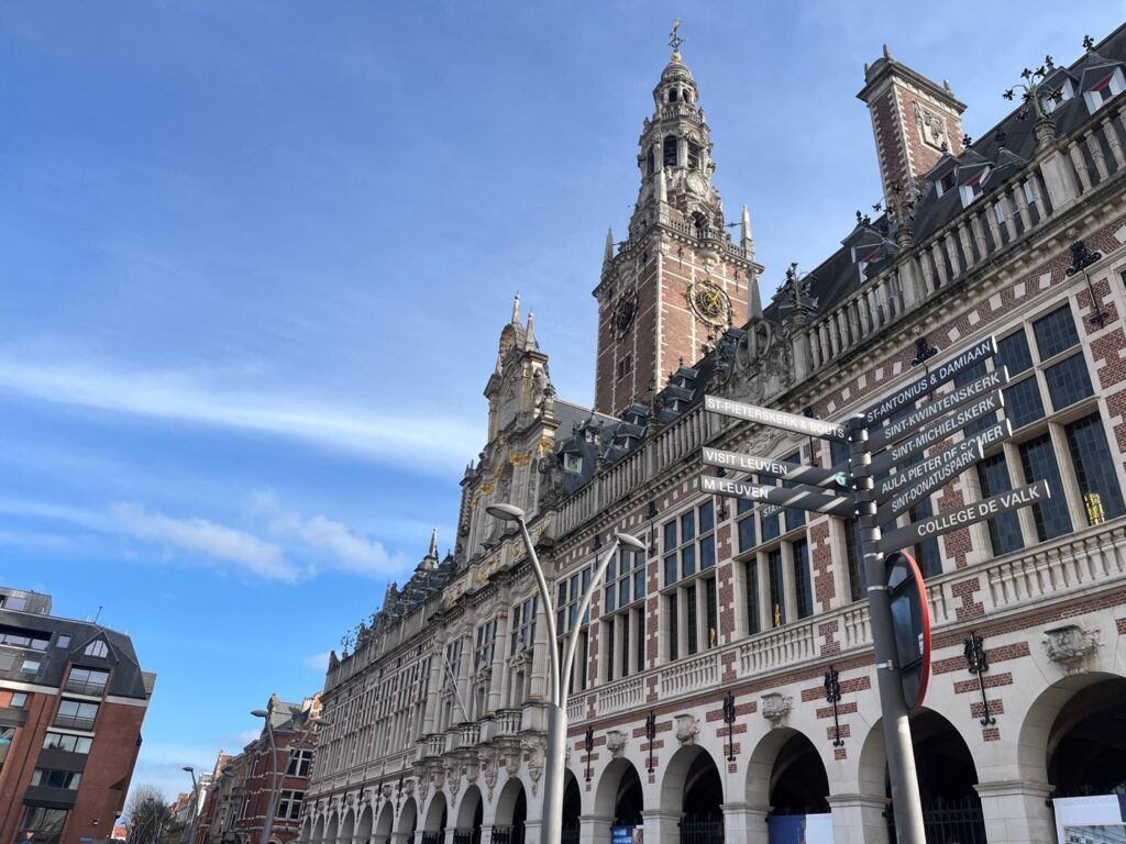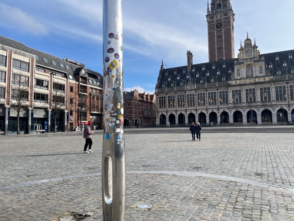 Terlepas dari julukan Si Paling Kota Pendidikan itu, Leuven memiliki sebuah “monumen” unik yang mungkin membuat kita bertanya-tanya. Mengapa ada kumbang raksasa yang tertancap di jarum setinggi 23 meter? Monumen itu bernama “Totem” karya Jan Fabre (atau di map tertulis: Jan Fabre’s Beetle Totem), seorang seniman multidisipliner kondang asal Belgia. Kumbang permata raksasa itu tertancap di awan—di awan? Yap. Siapa sangka Jan Fabre terfikirkan untuk menghadapkan jarum ke atas dengan maksud menancapkannya ke awan—di tengah alun-alun kota (Ladeuzeplein) tepat di depan bangunan perpustakaan (bibliotheek) megah nan bersejarah milik Katholieke Universiteit Leuven (KU Leuven).